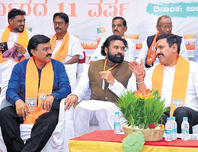 KOPPAL: BJP state president BY Vijayendra on Sunday visited Gangavathi, where he presided over a special meeting organised by the Koppal and Ballari distict units of the party. Interestingly, Gangavathi MLA Gali Janardhan Reddy and former minister B Sriramulu shared the same dais, with Vijayendra raising both their hands in unison, marking a reunion of sorts between the once ‘friends-turned-foes’.