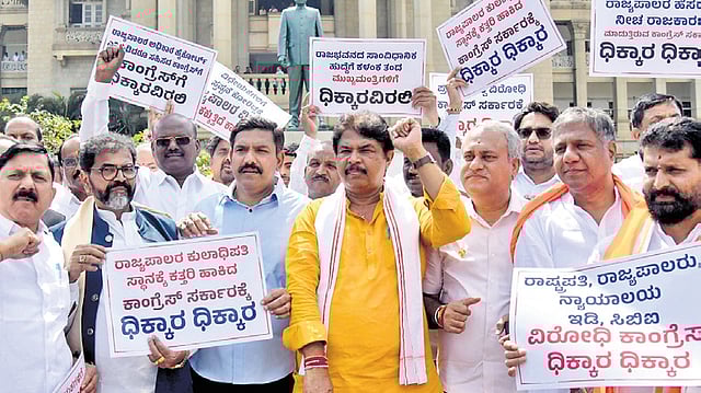 Prior to this, BJP members walked from Raj Bhavan to Vidhana Soudha, marking their protest against the State government for trying to curtail the Governor’s power. JDS members too attended the rally.