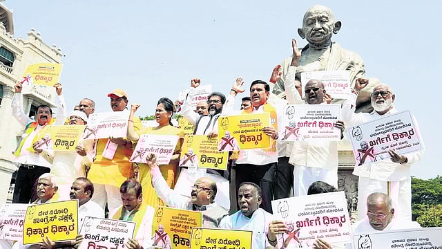 BENGALURU: BJP leaders and workers staged a protest in front of Mahatma Gandhi’s statue on the premises of Vidhana Soudha here on Thursday demanding that AICC president Mallikarjun Kharge apologise for his remarks against Prime Minister Narendra Modi.