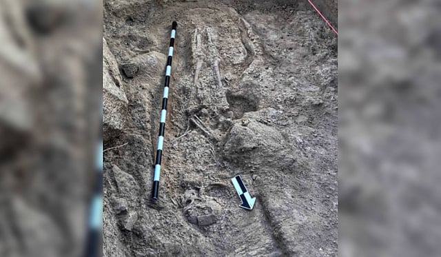 During excavation work last week, human bones were initially noticed beneath the soil. Further digging led to the unearthing of two complete human skeletons, each measuring approximately 5.5 feet in length, found lying side by side.