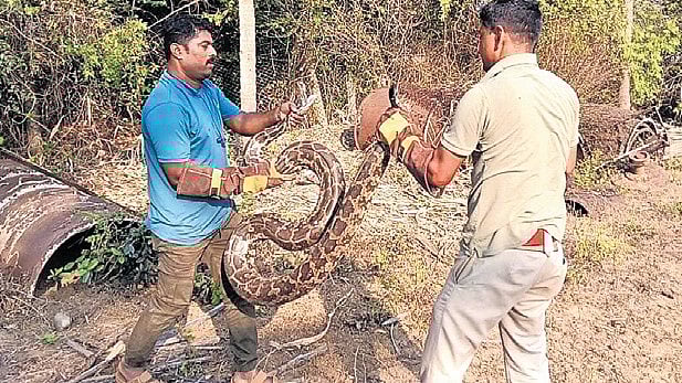 Rock pythons are a non-venomous species and started appearing in Karwar town during monsoon after the forest areas and lakes were cleared.