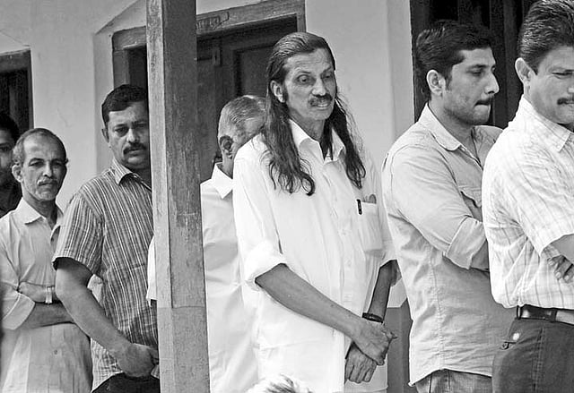 CPM politburo member Kodiyeri Balakrishnan cast his vote at the Kodiyeri Junior Basic School where he had studied for five years. Kodiyeri and family, including wife Vinidhini, sons Binoy and Bineesh and daughters-in-law Rineetta and Akhila stayed in the queue for an hour.