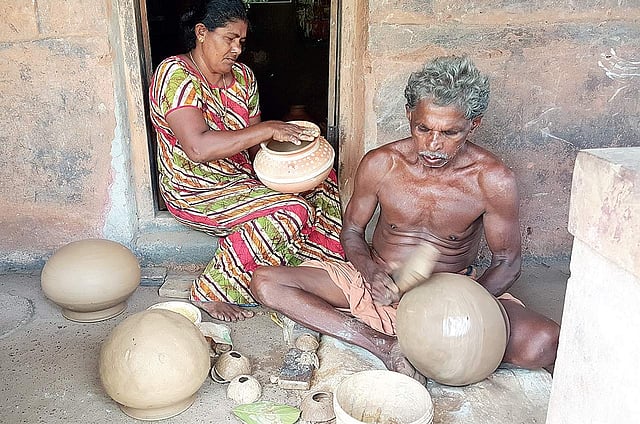 Back in Erikulam, an arch of Vetakorumakan Ishwaran temple welcomes people to the settlement of the Kushava community. “Our lives revolve around this temple,” says T M Kumaran (63), a master potter. He and his wife Draupadi still make pots and sell them. Friday was their last day of the season. On Monday, a day after Vishu, the entire community -- young men, women, children, the elderly -- would hit the paddy fields in front of their houses to extract clay for a whole year.