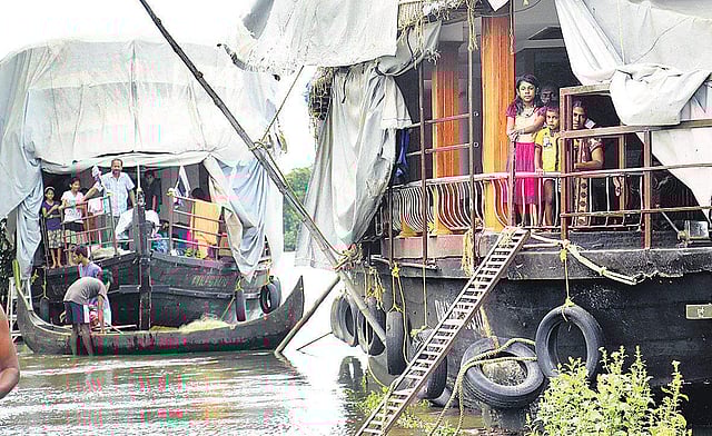 ALAPPUZHA: The word ‘houseboat’ is a synonym of leisure tourism in Kerala. However, literally, the houseboats of the backwaters of Alappuzha have become real abodes for many flood displaced people in Kuttanad. More than 3,000 people are staying in around 150 houses boats which have been moored on the shores of the Vembanad lake for the past seven days.Says Thomas Mathew, owner of PTR Holidays, a houseboat operator of Punnamada: “I have been staying in the houseboat for the past many days with my parents, wife and three children. My house, Parathara at Punnamada, was inundated by August 17. The water level had reached my neck. So we shifted from our house to the two-bed room houseboat anchored at Punnamada.”
