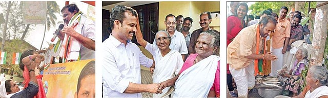 (From left) UDF candidate K Mohankumar, LDF candidate V K Prasanth and NDA candidate S Suresh campaigning for the bypoll in various regions of Vattiyoorkavu assembly constituency | Vincent Pulickal