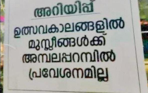 KANNUR: A board erected on the premises of Malliyottu ‘kavu’ at Kunhimangalam literally ridicules Kerala’s claims of being one of the most progressive states in the country. Interestingly, the kavu — where the board reading “Muslims are not allowed into the kavu premises during festival time” has come up — is in Kunhimangalam panchayat which has been ruled for years by LDF. The board exposes the hollowness of the claims by CPM, which takes pride in being the leaders of social progress in modern Kerala.