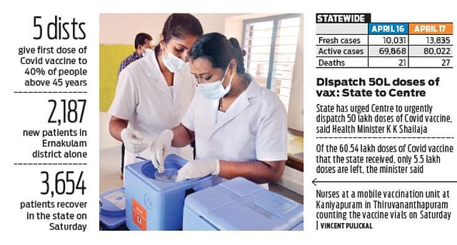 Of the 60.54 lakh doses of Covid vaccine that the state received, only 5.5 lakh doses are left, the minister said. The state has urged the Centre to urgently dispatch 50 lakh doses of vaccine, she said. Though medicine and oxygen are not in short supply in the state, the Centre has been informed of the need to augment the supply if the number of cases were to increase.
