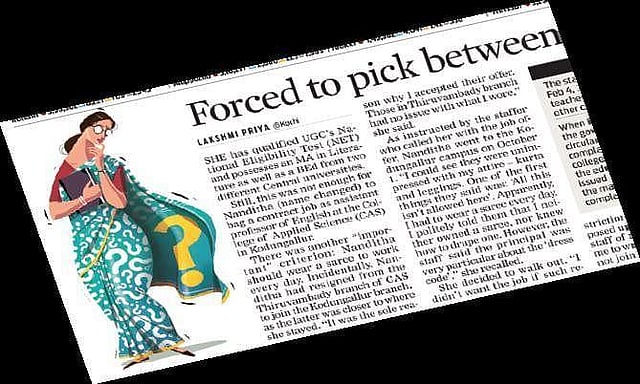 In the report, TNIE had highlighted how a young lecturer, who got a job offer from the College of Applied Science (CAS) in Kodungallur — which comes under the Institute of Human Resources Development (IHRD) — around a month ago, was informed by the management that it was mandatory for her to wear a saree to work every day if she wanted to continue working. Offended by the imposition, especially considering the fact that male professors did not have to adhere to a dress code, the lecturer had refused the job offer.