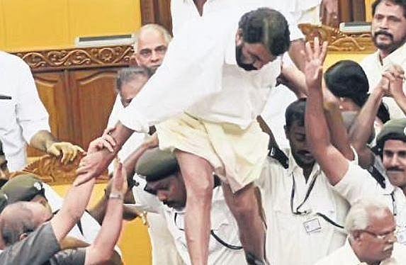 The leaders, who were on the Opposition side, broke chairs, snapped mikes and climbed atop tables protesting against then finance minister K M Mani. The speaker’s chair and computer were also damaged.