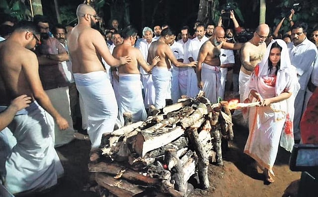Anupama lights the funeral pyre of her father K Sankaranarayanan at his ancestral house at Painkulam near Cheruthuruthy on Monday