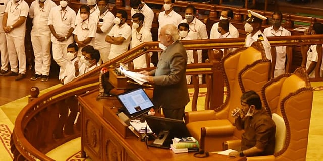 Governor Arif Mohammad Khan delivers the policy address in the Assembly on Friday.Speaker M B Rajesh is also seen.( Express Photo | BP Deepu)
