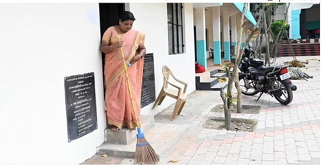 K R Usha Kumari sweeping the PSNM Government Higher Secondary School premises at Peroorkada in Thiruvananthapuram | Vincent Pulickal