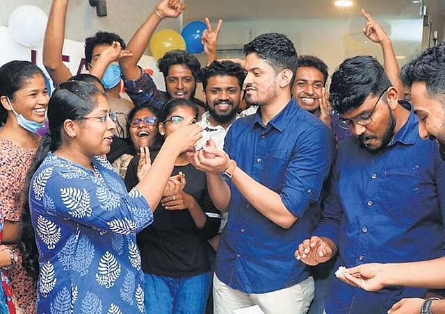 Athira S Kumar, Afnana Abdu Samad, Suresh Kumar and Sreekumar of Lead Academy, cut cake to celebrate their victory in the Civil Services Examination at the institute on Monday | B P Deepu