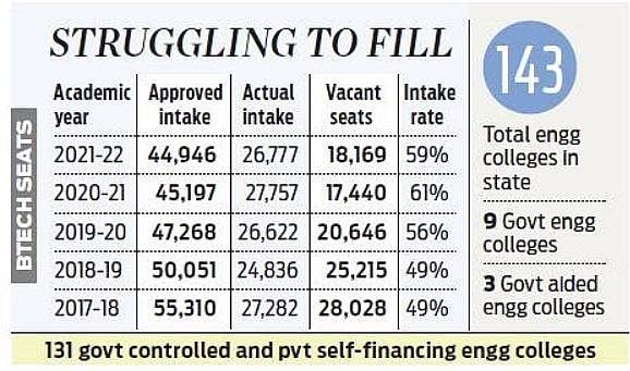 Meanwhile, engineering colleges in the state have struggled to fill seats. In the 2017-18 and 2018-19 academic sessions, nearly 51% seats out of 55,310 and 50,051 seats, respectively, were vacant. In 2019-20, 44% seats were vacant. The number of vacant seats dropped to 39% in the 2020-21 academic year but rose slightly to 41% in the 2021-22 session.
