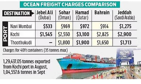 The volume of exports from Kochi port stood at 1,29,437.05 tonnes in August and 1,04,557.6 tonnes in September. Kerala exports 250 tonnes of fruits and vegetables by air per day and 375 containers of vegetables by sea per month. The freight charge for a 40-feet container from Kochi to Jebel Ali (Dubai) is $1,545, against $533 from Nhava Sheva port. The VKC group, which ships around 125 to 150 containers of footwear a month, has already shifted to Navi Mumbai.