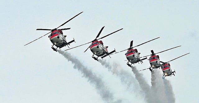 The event started with a procession of the Indian Air Force’s Air Warrior Drill Team (AWDT) followed by the Sarang team. The display by the Sarang team, which has been dazzling audiences since its formation in 2004, celebrated the agility and manoeuvrability of the Advanced Light Helicopters and the skills of IAF pilots.