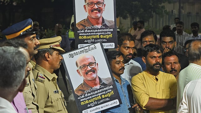 Citizens wait near the airport to receive the mortal remains of N Ramachandran, who was slain in a terrorist attack at Pahalgam in South Kashmir A Sanesh