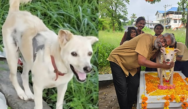 Sanakan K V, an autorickshaw driver at the local stand, recalls the day Eldho padded into their lives 14 years ago. “He wasn’t well. There was a burn scar on his left flank. We found out later he’d been picked up elsewhere under the ABC programme, sterilised, and released here,” he says. From day one, the dog’s liquid brown eyes and gentle manners won over the neighbourhood.