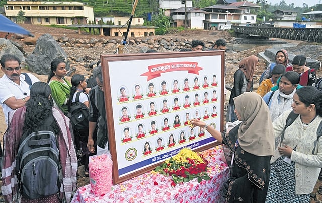 CHOORALMALA: With heavy hearts and tearful eyes, teachers from Vellarmala Government VHSS returned to Chooralmala on Wednesday to pay tributes to the 33 students they lost in last year’s devastating landslide. The teachers placed flowers at a newly installed hoarding bearing the smiling portraits of their beloved students—young lives now immortalised in memory, forever part of the hills they once called home.