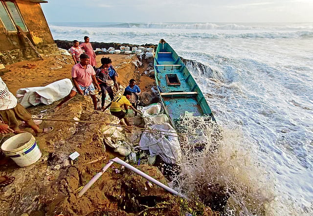 Fisherfolk at Kannanthura attempt to save their homes and shoreline by stacking sandbags and unused fishing boats B P Deepu