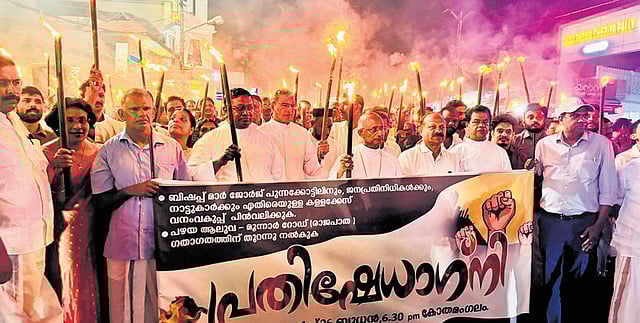 However, the decision to book Mar George Punnakottil triggered resentment with members of the Church taking out a torch rally in Kothamangalam town on Wednesday demanding the case against the former bishop be withdrawn and the Old Aluva-Munnar Road opened. The protest, inaugurated by Kothamangalam Bishop Mar George Madathikandathil, was led by MLA Antony, Vicar General Pius Malekandathil, Fr Robin Padinjarekuttu, Sijumon Francis and others.