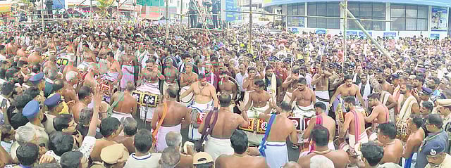 After the panchavadyam, the pandi melam, led by Cheranallur Sankarankutty Marar, began from the Madom. As it progressed, the spectators moved to the beats of the melam taking the celebration to the next level.