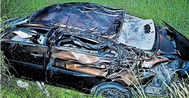 The vehicle first crashed into a roadside milestone and a tree before plunging into a paddy field below. The impact was so severe that the car was completely destroyed, and a large section of the tree was sheared off.