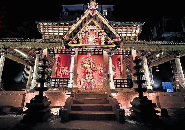 At South Kolkata’s famed 66 Pally Club’s Durga Puja, the pandal itself tells the story. Built in the style of a traditional Kannur temple, its architecture draws directly from Kerala’s vastu vidya. Crafted over three months by a team of carpenters from Thalassery, the structure is both a tribute to tradition and a bold experiment in cultural fusion. It cost nearly Rs 25 lakh to complete, but its impact goes far beyond numbers.
