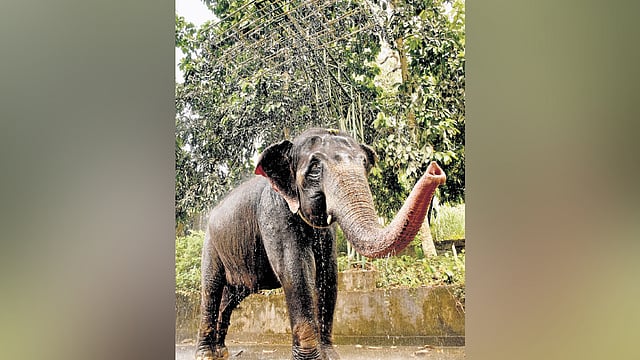PATHANAMTHITTA: Under a set of huge metallic-pipe squares that splash water like in rain, Meena, a middle-aged female elephant, stands still for a moment, closing her eyes, and then sways, splashes, and settles into the rhythm of cooling water.