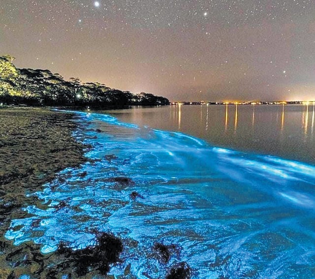 Some varieties of microorganisms, such as algae, bacteria, and fungi, have the ability to absorb sunlight in saline water and release it when agitated. The scientific world calls this bioluminescence.