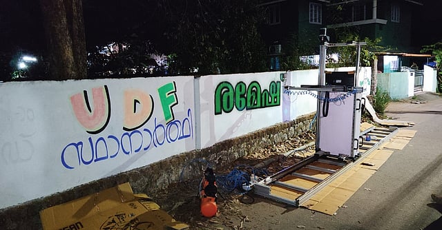 In the video, a machine is seen inscribing the name of UDF candidate Ramesh Pisharody on a wall in Palakkad within minutes, executing the task with precision and uniformity. The demonstration quickly gained significance, with Shakkib receiving a surge of calls from various political parties and candidates, all seeking access to the technology. The video became so popular at a time when all of them were struggling to get time-slots of the conventional graffiti artists amid acute shortages and delays during the peak campaign period.