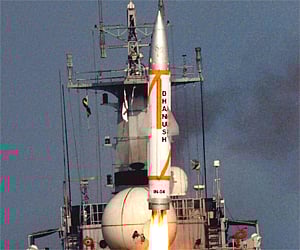 Dhanush missile, the naval version of Prithvi ballistic missile, was fired from INS Suvarna anchored about 35 km from the coast between Paradip and Puri at about 10.03 am followed by Prithvi-II which was launched from the LC-III of the ITR at 11 am.