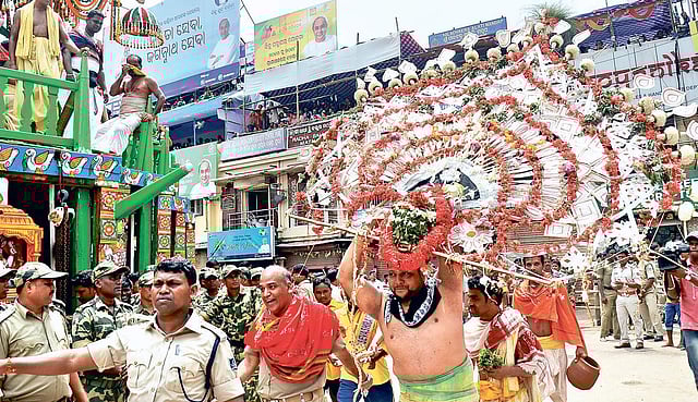 With a few months left for the upcoming general and Assembly elections, this year’s Rath Yatra became the right occasion and Grand Road at Puri the right place for political parties, especially the BJD in State and BJP in Centre, to showcase their strength and highlight their achievements. Among many dignitaries who came to Puri to pay their obeisance to the Trinity, were BJD supremo and CM Naveen Patnaik as well as Union Petroleum Minister and BJP’s poster boy in the state Dharmendra Pradhan. Apart from presence of these heavyweights, the Grand Road was filled with posters and hoardings of BJD and BJP governments and their leaders.