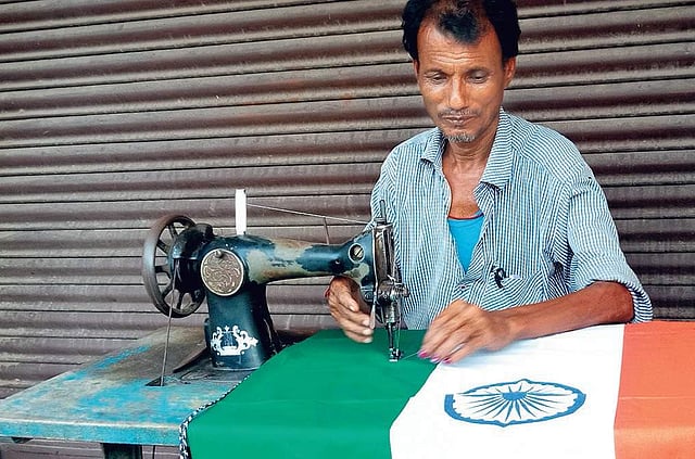 The tailors are busy stitching the tri-colour to meet the huge demand. With Independence Day a few days away, the tailors are sitting on heaps of coloured clothes from which the national flags will be made.