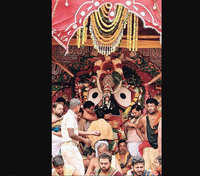 Earlier in the day, temple servitors performed the set of rituals like mangala alati, mailum, abakash, Surya puja and rosahoma before offering khichdi bhog to the Trinity and dressing them up for pahandi.