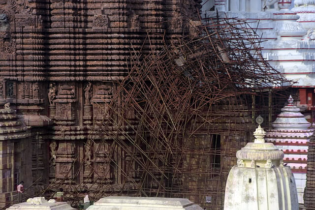Damaged scaffoldings on the southern side of Shri Jagannath temple, Puri (Photo | Biswanath Swain/EPS)