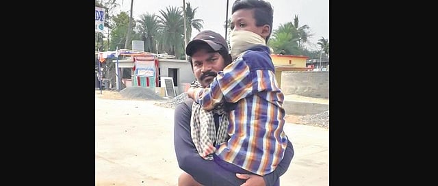 KENDRAPARA: There could not be a more heart-wrenching picture of the Government’s failure to come to the aid of the most needy than the sight of a man carrying his physically-challenged son on shoulders and starting a 200 km journey on foot as he has no other way to survive. A 40-year-old brick kiln worker Chakradhar Munda started the arduous walk on Friday with his eight-year-old son in his arms and wife alongside from Pattamundai to his native Ghasipura village in Keonjhar district as the owner denied food or money to him.