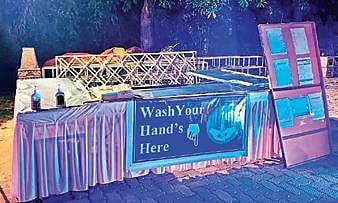The kiosk set up outside the entry of reception venue, had a washbasin along with liquid soaps on one side and on the other, there was a display board pinned with IEC (information, education, communication) materials regarding precautionary measures.