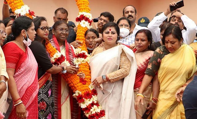 NDA Presidential candidate Droupadi Murmu being welcomed during her campaign in Bhubaneswar. (Photo | EPS)