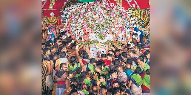 PURI: On Saturday, late in the evening, Lord Jagannath, Lord Balabhadra and Devi Subhadra were escorted into the sanctum sanctorum of the Srimandir from their chariots in ‘pahandi’ by Daita servitors marking Niladri Bije (homecoming of Trinity).