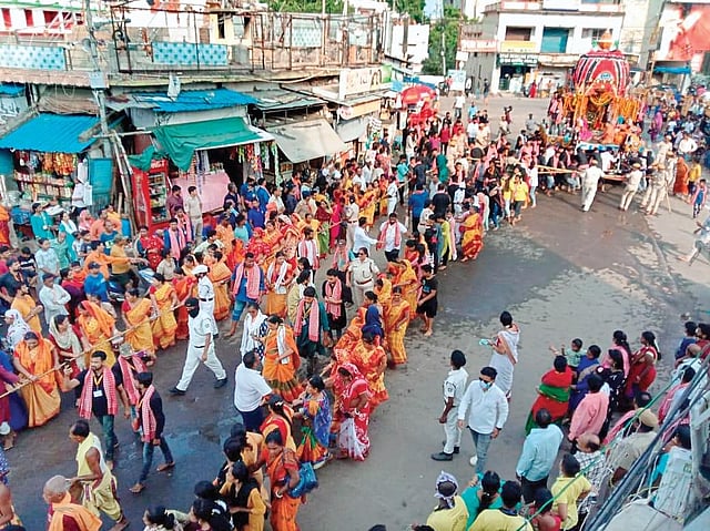 CUTTACK: While the entire state was seen soaking in the Rath Yatra fervour on Tuesday, in Cuttack too, the Car Festival was celebrated with pomp and gaiety. Despite the sweltering heat, hundreds of devotees were seen thronging different Jagannath temples to take part in the annual sojourn of the Trinity. As usual, there was a huge footfall of devotees at the Jagannath temple in Chandni Chowk and Patitapaban temple at Dolamundai.