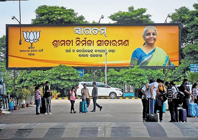 A hoarding on Finance Minister Nirmala Sitharaman’s visit to the state at Bhubaneswar airport | DEBADATTA MALLICK