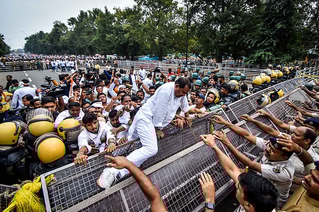 The lower PMG square area in front of the Lok Seva Bhawan turned into a battle ground when hundreds of Congress workers led by president of Odisha Pradesh Congress Committee Sarat Pattanayak and Odisha in-charge Ajoy Kumar were stopped by police as they made their way towards Lok Seva Bhawan.