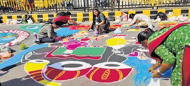 BARGARH: With two days left for the largest open-air theatre in the world, ‘Dhanuyatra’ to begin in Bargarh, the organising committee has geared up to make the 76th edition of the mass festival a grand success. The 11-day event will begin on January 15 and conclude on January 25.Prior to the festival, on Saturday, a Rangoli Mahotsav themed on Dhanuyatra was organised by the promotion committee where in front of the Women’s College to Gourpada in Bargarh town turned into a canvas for more than 400 artists who made rangolis over 560 ft x 20 ft stretch of road.