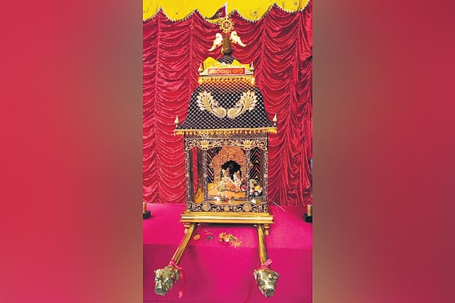 Adorned with intricate gold filigree work, the five feet-long palanquin with idols of Lord Krishna and Devi Radha installed inside it, was put on display in front of the Madan Mohan Jew temple at Kathagada Sahi on the occasion of Dola Dashami on Tuesday.