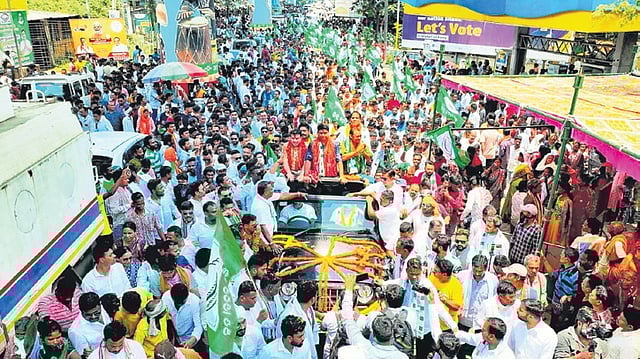 Earlier, Das and Pujari reached the Samaleswari Temple to seek the blessings of the presiding deity and then headed to the Jail Chowk where they garlanded the statue of freedom fighter Veer Surendra Sai. The two leaders along with the party workers headed back to Balibandha Chowk from where the massive rally took off.