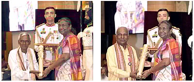 BHUBANESWAR: Two more unsung heroes from Odisha, 85-year-old Bhagabat Pradhan and 78-year-old Shilpi Guru Binod Kumar Maharana, were conferred Padma Shri by President of India Droupadi Murmu at the Civil Investiture Ceremony-2 in Rashtrapati Bhavan on Thursday.