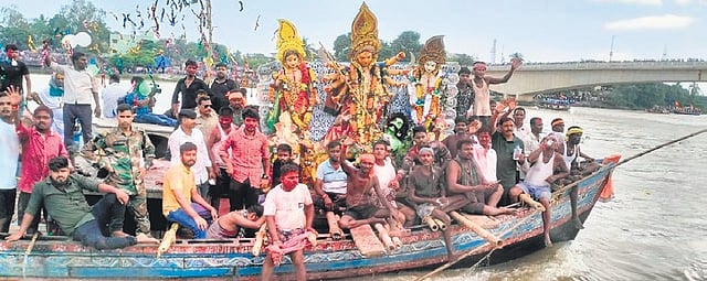 Jagannath Dash, a local, said many years back owing to non-construction of bridges, puja committees used to take the idols from one village to another to allow devotees get a final glimpse of the Goddess before Her immersion. “Though the area is well-connected with pucca roads and bridges now, idols are still ferried in boats before immersion to preserve the age-old tradition,” he said.