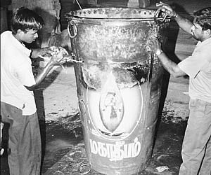 The 5 feet tall copper lamp weighing about 150 kg is brought out of the temple four days in advance of the event.