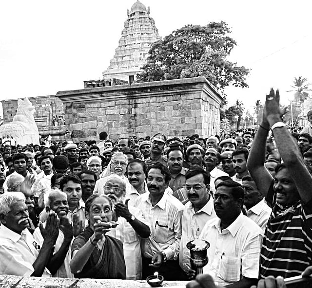 Thousands of people, including women and children, thronged the Chozeeshwarar Temple on Friday evening and a huge rally started from Maaligai Medu, the village where remains of the king’s palace were excavated.